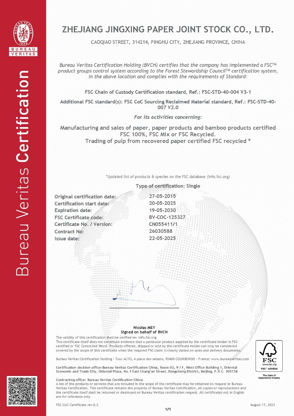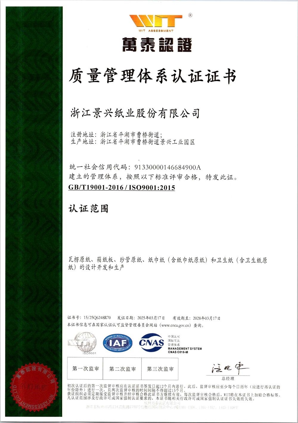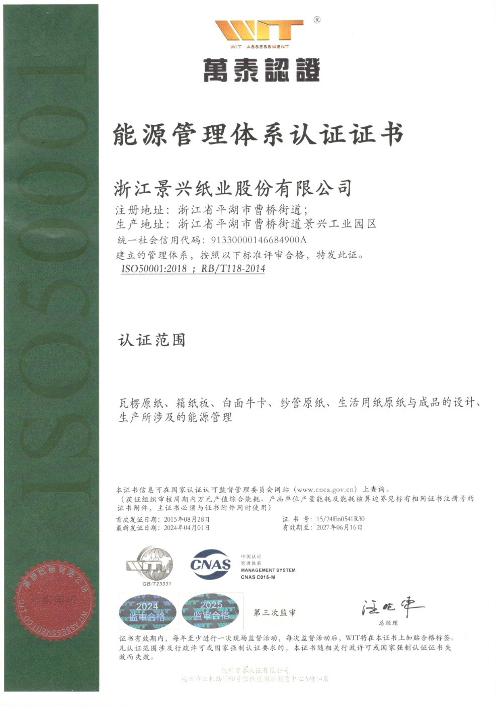 景興紙業于1996年率先在同行業通過ISO9001質量管理體系認證,2002年通過ISO14001環境管理體系認證,2014年通過OHSAS18001職業健康安全管理體系認證,2015年通過GB/T23331能源管理體系和FSC?森林體系認證,2018年通過兩化融合管理體系認證。